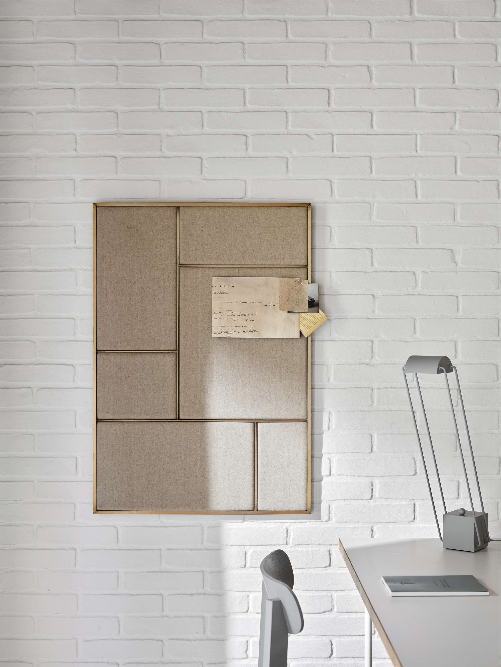 NOUVEAU PIN is a versatile pinboard, perfect for framing your cherished memories— from photos to concert tickets. Or why not use it as your personal mood board? The board is built around a rectangular grid, inspired by the clean lines of modern urban architecture and the Art Nouveau style. NOUVEAU PIN is available in three sizes, all designed with a shared dimension on one side, allowing you to choose a single pinboard or combine multiple ones to create a pattern that suits your needs—whether at home or in the office. A gripping edge runs along all four sides, fitting seamlessly with the included mounting brackets. Additionally, the board has a sound-absorbing effect, helping create a calm and peaceful atmosphere.