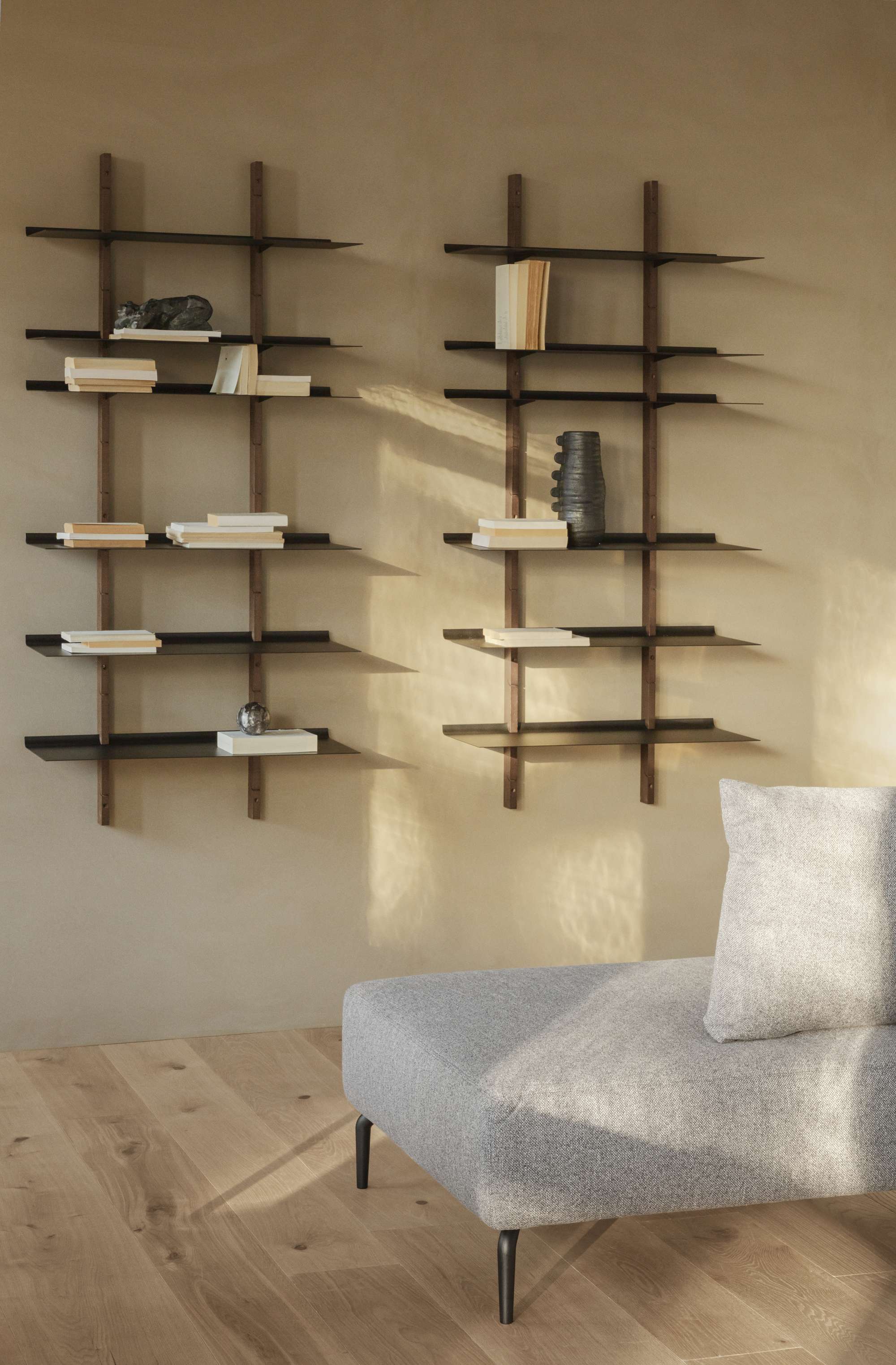Smile consists of grooved oak uprights and removable shelves. Due to the way in which each shelf slides neatly into the side supports, there is no need for extra brackets or pins when moving the shelves around. You can therefore assemble the shelves to suit your home, and rearrange them as your needs change.